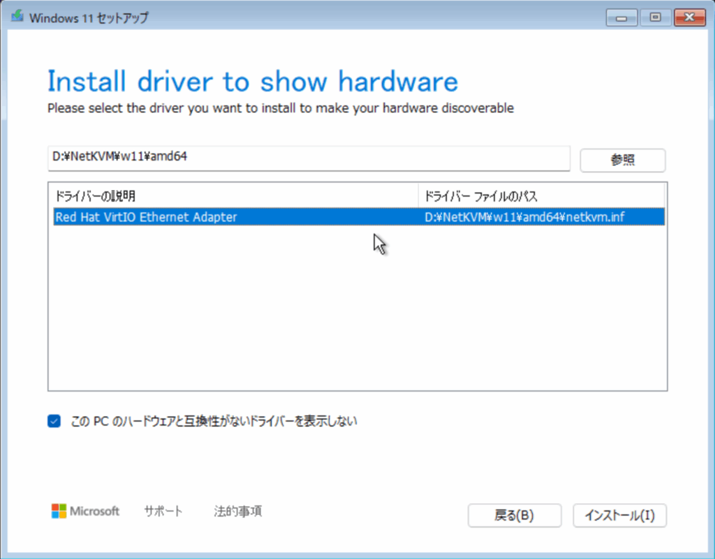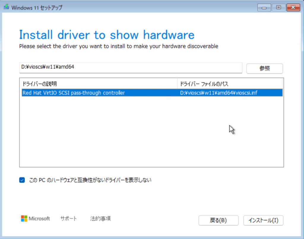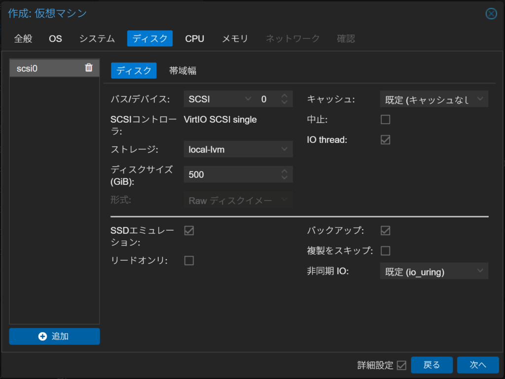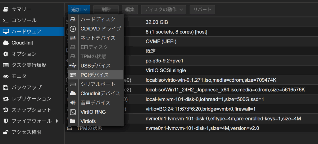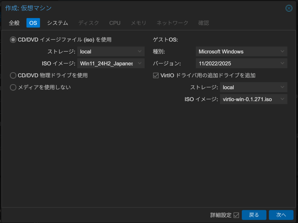 ③VertIO ドライバ用の追加ドライブを追加に☑チェックを入れ[ISOイメージ:]に[virto-win-0.1.271.iso]を指定する。