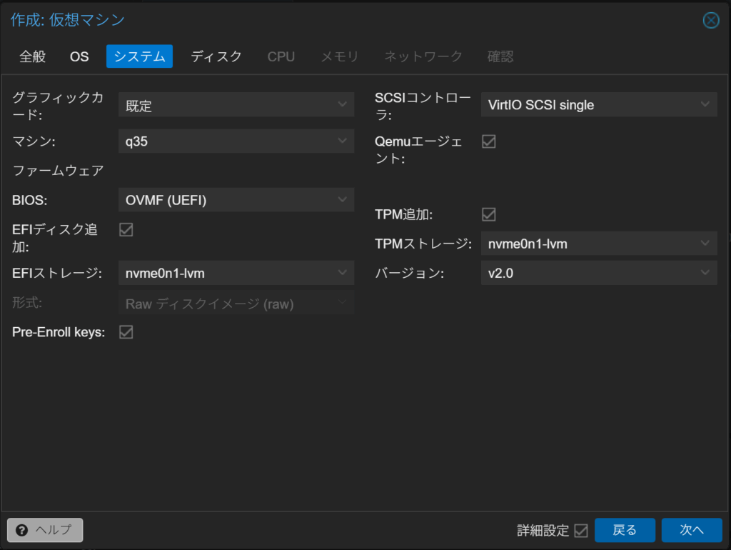 [EFIストレージ:]、[TPMストレージ:]の保存先を選択する。